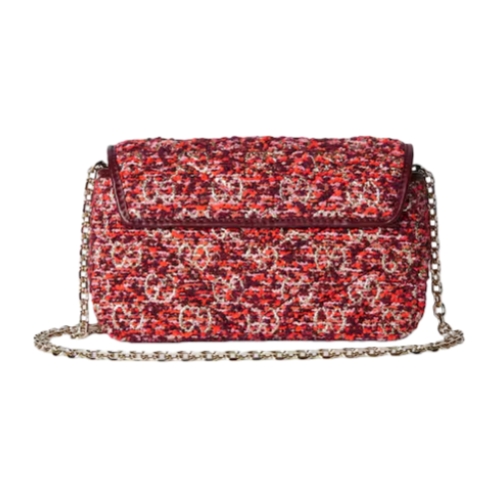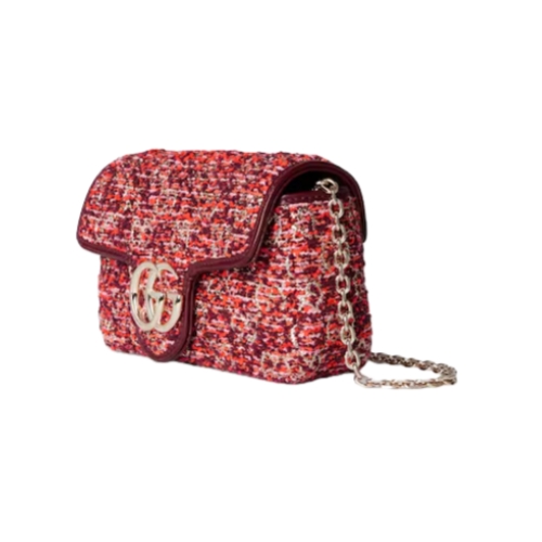 The GG Marmont, a signature collection of the House, features the Double G hardware, a faceted chain strap, and soft construction, further elevated in GG tweed leather on this shoulder bag silhouette.