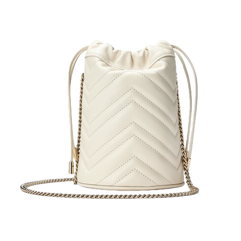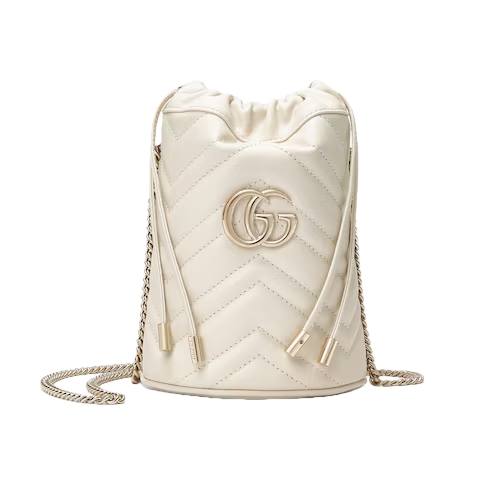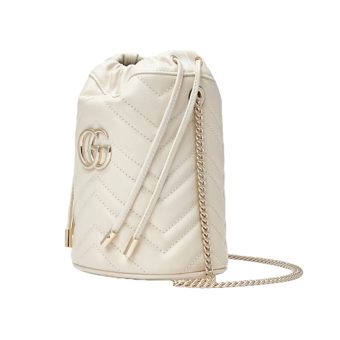 This bucket bag presented in white matelassé leather with a heart detail on the back. The GG Marmont collection is defined by the emblematic Double G hardware—a contemporary take on a Gucci archival belt buckle from the '70s that has become a hallmark of the House. Completed by a gold-toned chain strap, the dynamic shape can be worn in multiple ways.