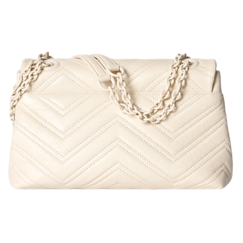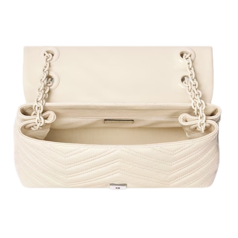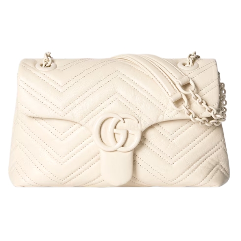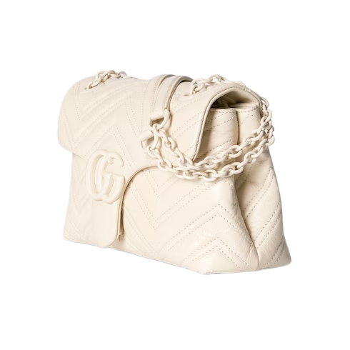 The GG Marmont, a signature collection of the House, features the emblematic Double G and a faceted chain strap on softly structured designs. This new shoulder bag is crafted from soft lightweight matelassé chevron leather, complete with tonal enameled hardware.
