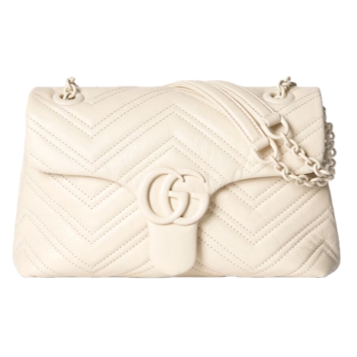 The GG Marmont, a signature collection of the House, features the emblematic Double G and a faceted chain strap on softly structured designs. This new shoulder bag is crafted from soft lightweight matelassé chevron leather, complete with tonal enameled hardware.
