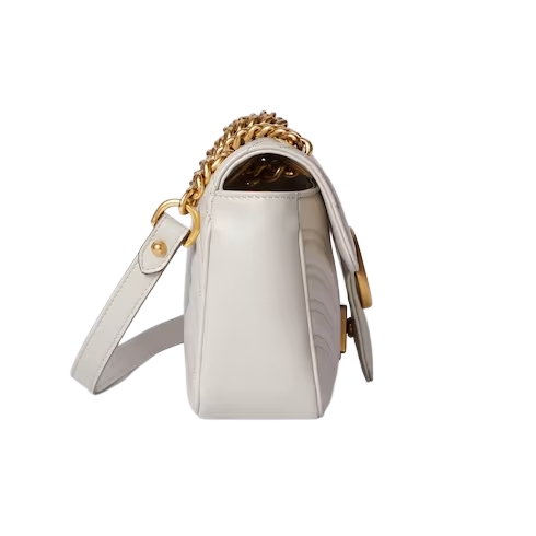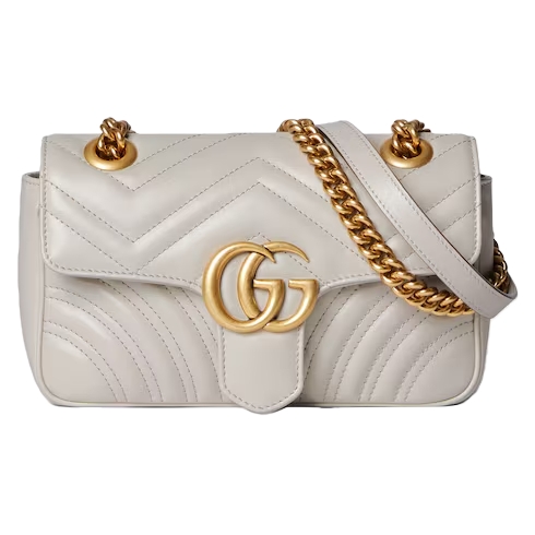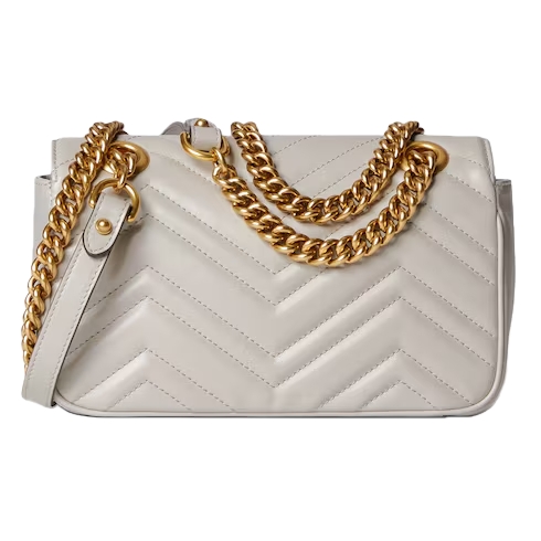 Made in matelassé chevron leather in a neutral shade of light grey, the GG Marmont small shoulder bag has a softly structured shape and a flap closure with Double G hardware. Designed to be worn multiple ways, the chain strap slides to change between a shoulder and a top handle bag.