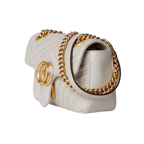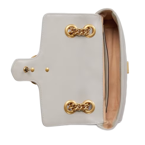Made in matelassé chevron leather in a neutral shade of light grey, the GG Marmont small shoulder bag has a softly structured shape and a flap closure with Double G hardware. Designed to be worn multiple ways, the chain strap slides to change between a shoulder and a top handle bag.