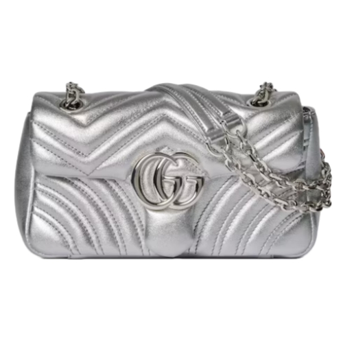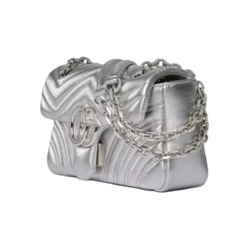 The GG Marmont, a signature collection of the House, features the Double G hardware, a faceted chain strap, and soft construction, introducing lamé leather on this shoulder bag silhouette.