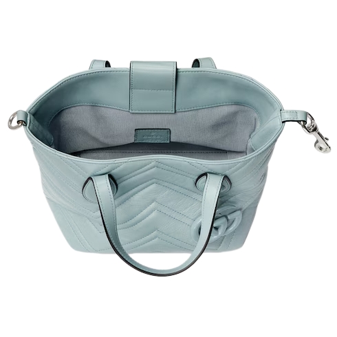 The GG Marmont, a signature collection of the House, features the Double G hardware and soft construction in an exceptionally supple leather. This design highlights the emblematic hardware as a bag charm, and can change from a structured tote to soft-shaped bucket for versatility.