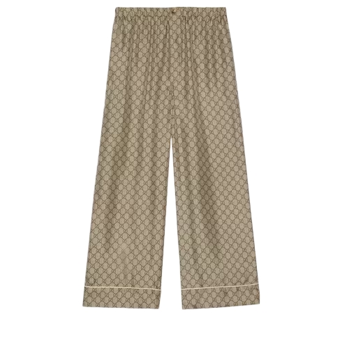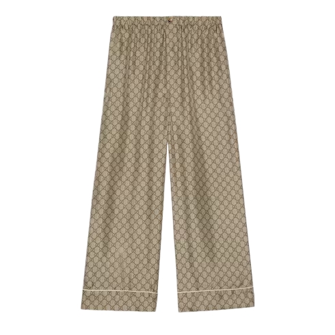 Essential pieces in the Pre-Fall 2023 collection are embellished with signature Gucci motifs for the wardrobe. This relaxed pant is presented in GG Supreme printed silk with a tonal piped trim, speaking volumes about stylish comfort.