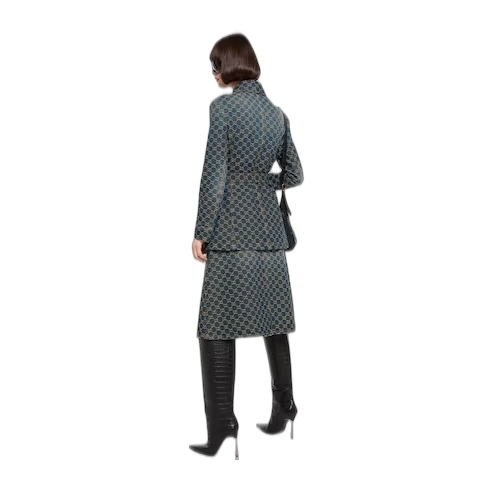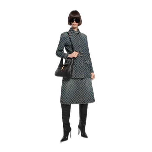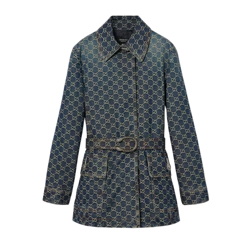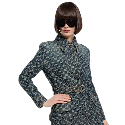 Introducing Spring Summer 2026. This style is part of the La Famiglia collection, which reinterprets the House’s codes through singular personalities and distinctive aesthetic attitudes. Crafted from bleached certified GG cotton denim jacquard, this jacket is enriched with an adjustable Dionysus buckle belt.