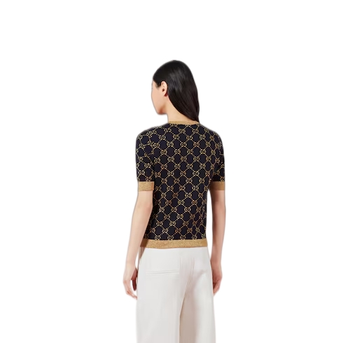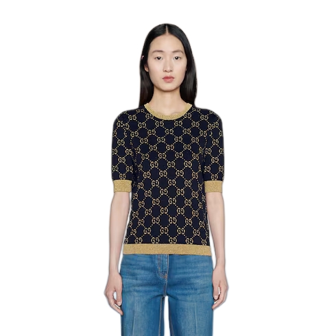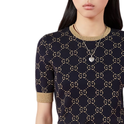Gucci continues to explore incorporating original design elements into new collections. The emblematic monogram motif from the 1970s is reinterpreted in gold lamé contrasted by a dark blue.