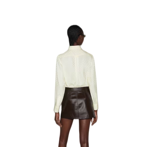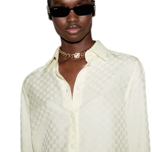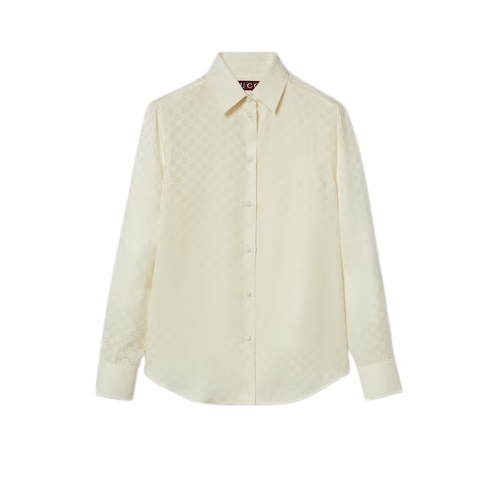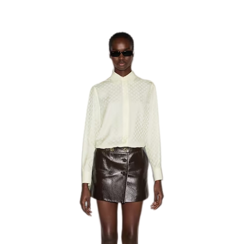 The GG motif appears in unexpected colors and fabric combinations, from linen blend to nylon. This regular fit shirt is presented in a GG crêpe silk, referencing the House's instantly-recognizable monogram motif. Self-covered buttons add the finishing touch to the silhouette.