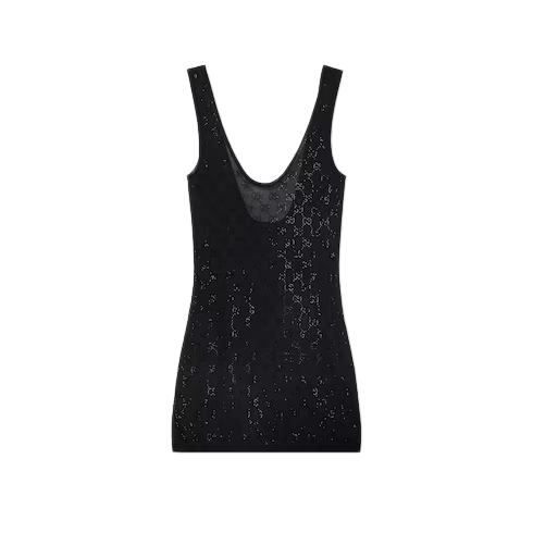 Introducing Spring Summer 2026. This style is inspired by the "La Diva" look of La Famiglia. The collection reinterprets the House’s codes through singular personalities and distinctive aesthetic attitudes. This mini dress is enriched with an allover heat-applied GG crystal embroidery.