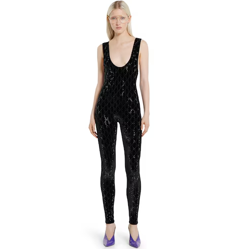 In the Fall Winter 2025 collection, stretch chenille is reimagined with a luminous touch. This jumpsuit is embellished with allover GG crystal embroidery, combining signature codes with a contemporary attitude.