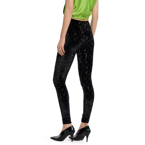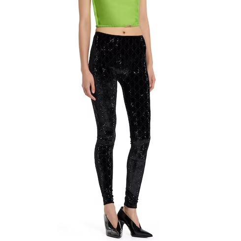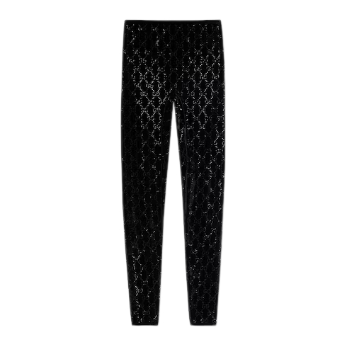 In the Fall Winter 2025 collection, stretch chenille leggings are reimagined with a luminous touch. The style is embellished with allover GG crystal embroidery, combining signature codes with a contemporary touch.