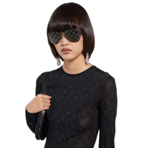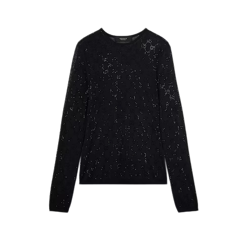 Introducing Spring Summer 2026. This style is inspired by the "La Diva" look of La Famiglia. The collection reinterprets the House’s codes through singular personalities and distinctive aesthetic attitudes. This crewneck top is enriched with an allover heat-applied GG crystal embroidery.