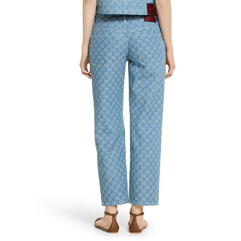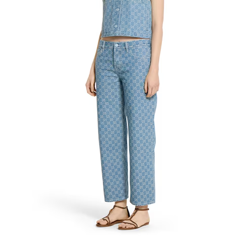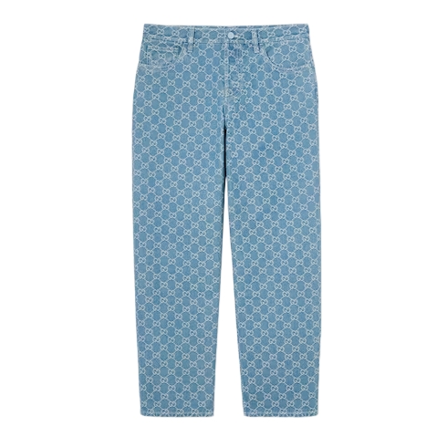 The House's heritage motifs are presented on a backdrop of sophisticated textures, from off-duty denim to lightweight canvas and refined suede, for the Pre-Fall 2025 collection. The GG denim jacquard returns atop a contemporary pair of pants, complete with tonal enamel Gucci button and naplak label.