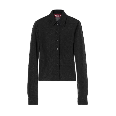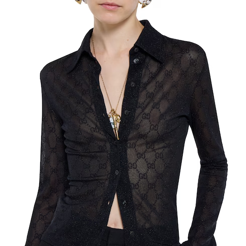 In the Cruise 2026 collection, crystal embellishment is featured in attires that glow from day to night, revisiting signature motifs such as the GG pattern and Horsebit motif. Crafted from GG sheer jersey jacquard, this shirt is finished with a polo collar.