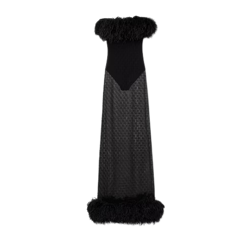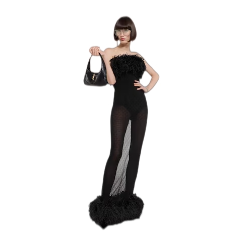 Introducing Spring Summer 2026. This style is featured as part of the "La It Girl" look of La Famiglia, which interprets the House's codes through singular personalities and distinctive aesthetic attitudes. This long dress is presented in black GG lace, while a detachable body completes the piece.