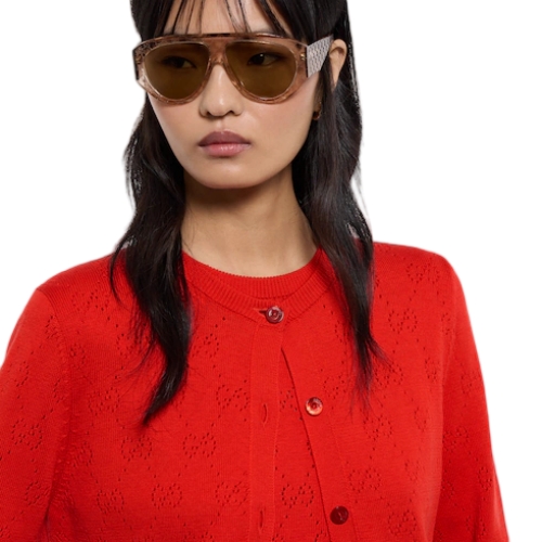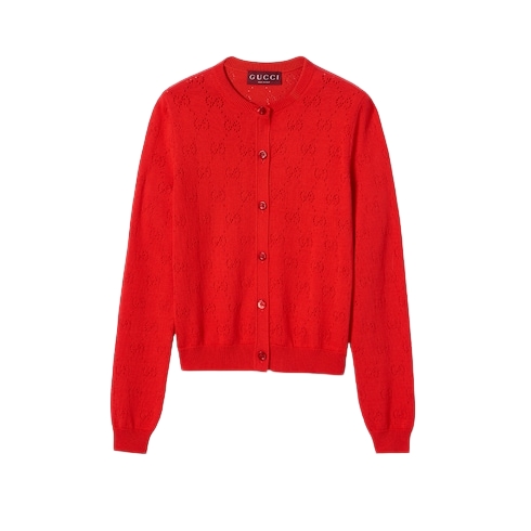 In the Cruise 2026 collection, women's ready-to-wear pieces transition into a new season with bright colors which take center stage across GG motif knitwear. This cardigan is crafted from GG pointelle cotton silk.