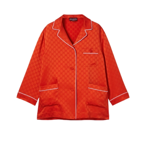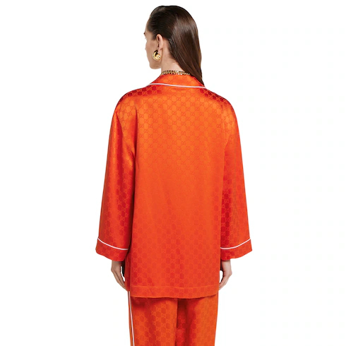 For the Pre-fall 2025 collection, colorful tops and dresses infuse ready-to-wear with a vibrant twist for the transitional wardrobe. This shirt in a bright orange is crafted from a delicate GG satin, complete with contrasting piping trim.