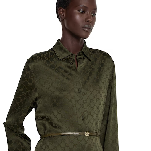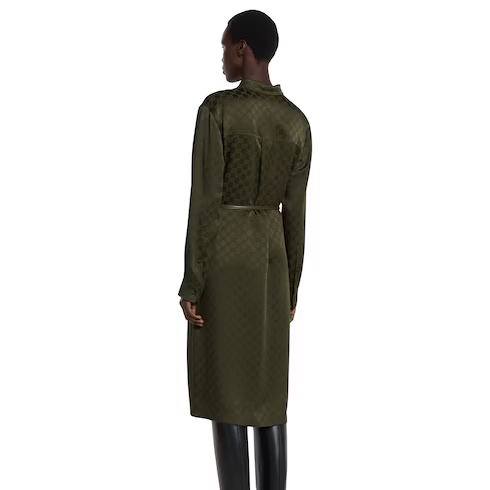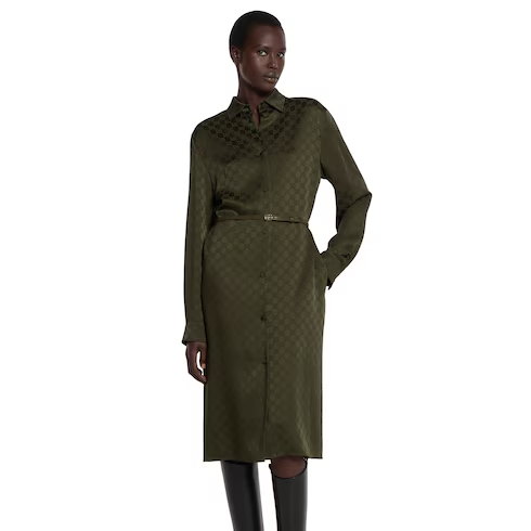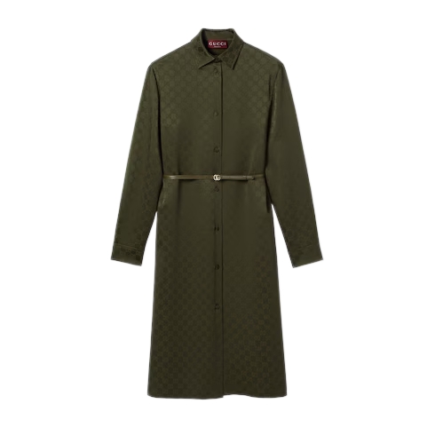 Green defines the color narrative for Pre-Fall 2025 and speaks volume with textures, logo details and varying tonalities, as seen on the runway. This shirt dress in the distinctive hue, appears in GG satin and is complete with a Double G belt.
