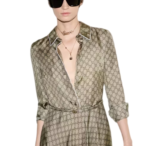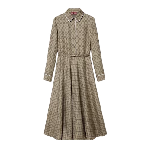 Taking inspiration from founder Guccio Gucci's monogram, the GG motif continues to be a firm favorite of the House. Here it's presented across a silk twill dress, with a piped trim and Double G buckle bringing further definition to the silhouette.