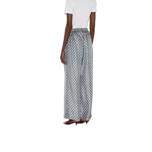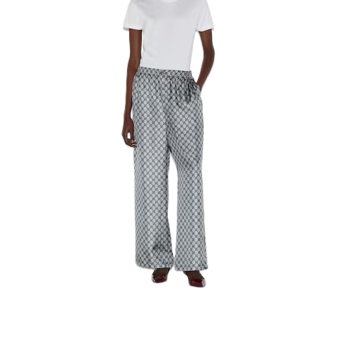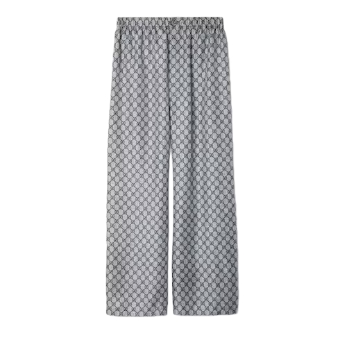 Inspired by the summer spirit and beach clubs on the Italian coast, this item is part of Gucci Lido. For the Pre-Fall collection, essential pieces are embellished with signature Gucci motifs for the wardrobe. This pair of pants is presented in GG printed silk with a tonal piped trim, speaking volumes about stylish comfort.
