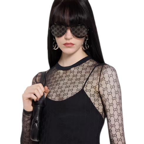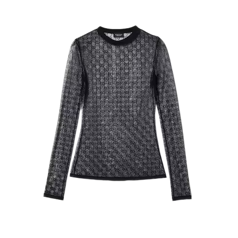 Introducing Spring Summer 2026. This style is inspired by the "La It Girl" look of La Famiglia. The collection reinterprets the House’s codes through singular personalities and distinctive aesthetic attitudes. This T-shirt is presented in GG stretch lace.
