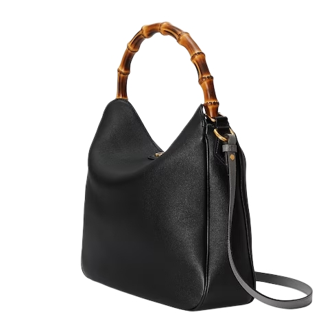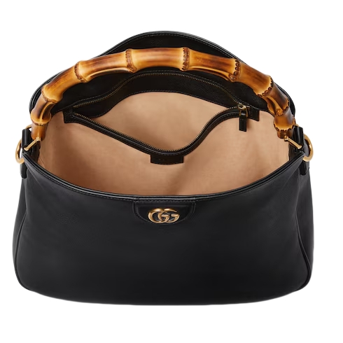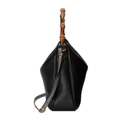 Combining recognizable elements of the House, the large-sized shoulder bag is defined by its bamboo handles and Double G hardware. Crafted from black leather, the accessory is further accentuated by a contrasting leather shoulder strap.