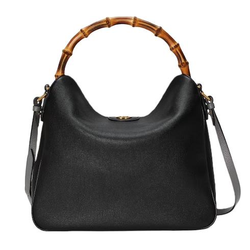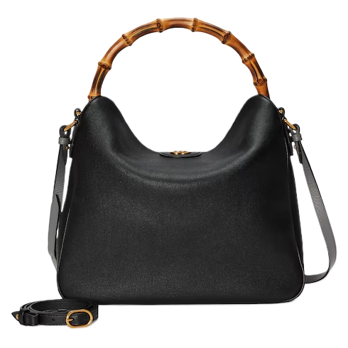 Combining recognizable elements of the House, the large-sized shoulder bag is defined by its bamboo handles and Double G hardware. Crafted from black leather, the accessory is further accentuated by a contrasting leather shoulder strap.