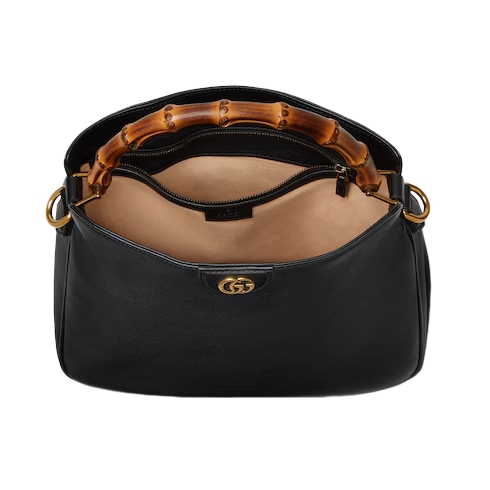 Combining recognizable elements of the House, the shoulder bag is defined by its bamboo handles and Double G hardware. Crafted from black leather, the accessory is further accentuated a contrasting leather shoulder strap in grey.
