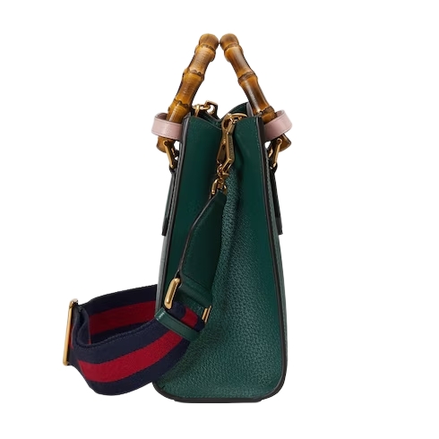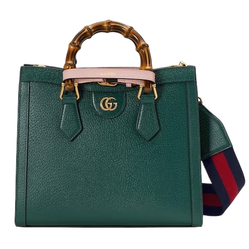 The concept of reinvention continues to shape the House's designs. An evolution of a bamboo handle tote first introduced in 1991, the Gucci Diana represents the notion of style in constant evolution. The design plays with traditional details and renews them new meaning. Playing with this idea, the functional bands used to keep bamboo handles in shape are reimagined as playful leather belts. Here, the tote is introduced in green leather.