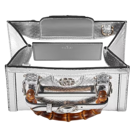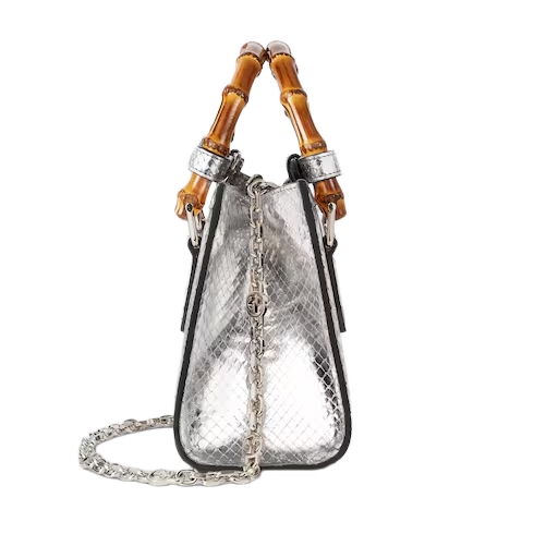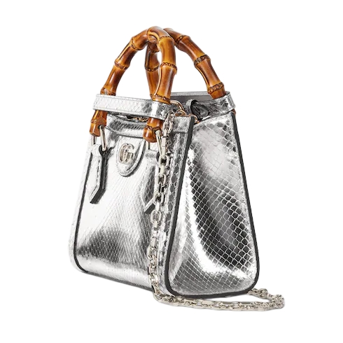 The Gucci Diana tote bag blends recognizable elements of the House, such as the bamboo handles and Double G hardware. This style is crafted from silver-toned python, and can be worn crossbody with the detachable and adjustable shoulder strap.