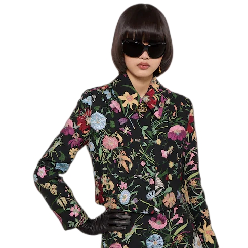 Introducing Spring Summer 2026. This style is inspired by the "La Contessa" look of La Famiglia. The collection reinterprets the House’s codes through singular personalities and distinctive aesthetic attitudes. This jacket is presented in Gucci Flora silk brocade.