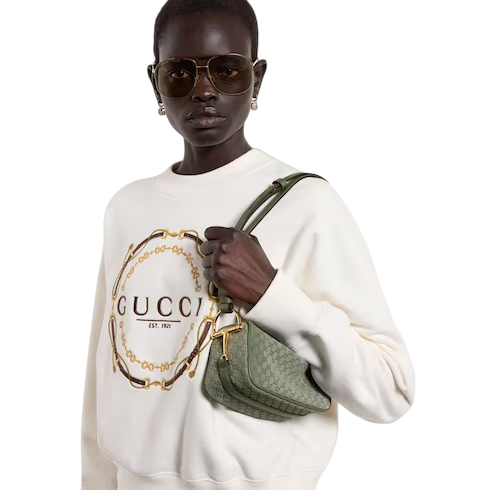 Gucci Half Horsebit offers a contemporary take on one of the House’s most emblematic codes, reimagining the signature hardware on supple leather which moulds to the body. This mini bag is stated in embossed GG suede and features a Half Horsebit detail at the side.