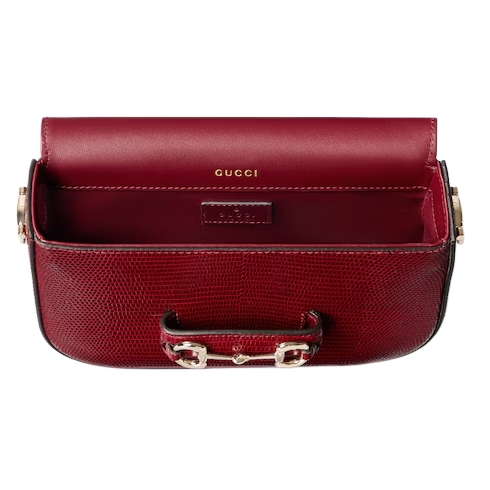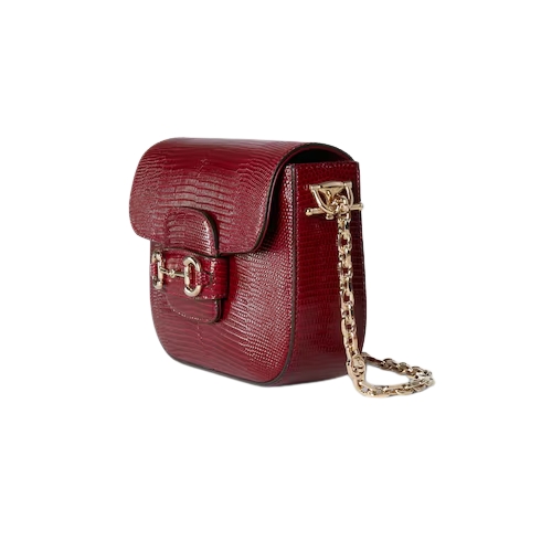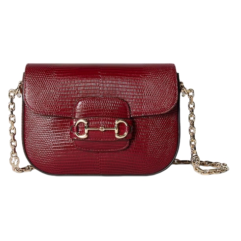 This Gucci Horsebit 1955 mini bag is crafted from precious lizard leather in an emblematic shade, complete with light gold-toned details such as the double ring and bar hardware and intricate chain shoulder strap.