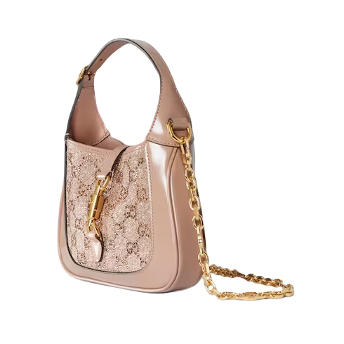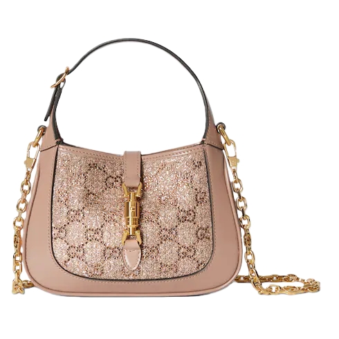 The Gucci Jackie 1961 tells an enduring story with its signature piston closure and emblematic shape. Crafted from lamé fabric with GG crystal embroidery, this bag reveals a color-coordinated leather lining, and is complete with an intricate chain strap in light gold-toned finish.