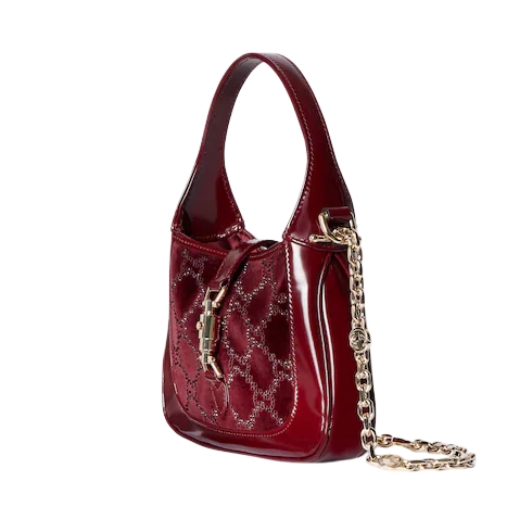 The Gucci Jackie 1961 with its signature piston closure and emblematic shape tells a story that spans eras. Crafted in velvet and GG crystal motif, this style is complete with an intricate chain shoulder strap in light gold-toned finish.