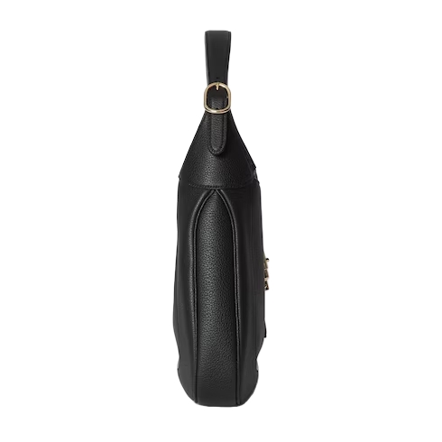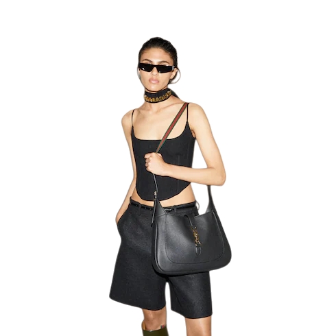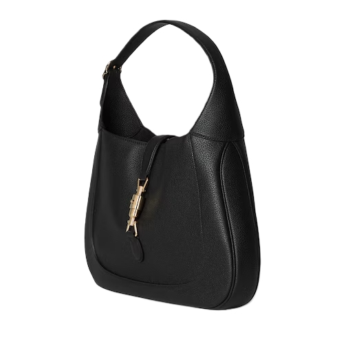 In the Fall Winter 2024 collection, the Gucci Jackie 1961 shoulder bag with new light gold-toned piston closure features fine black leather, highlighting the craftsmanship, crescent shape, and sleek silhouette of the House's iconic handbag.