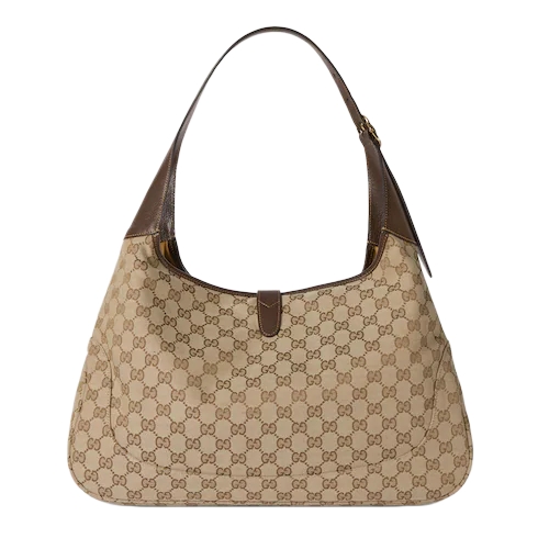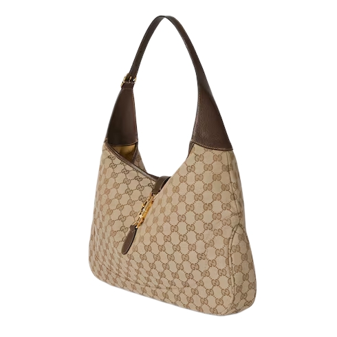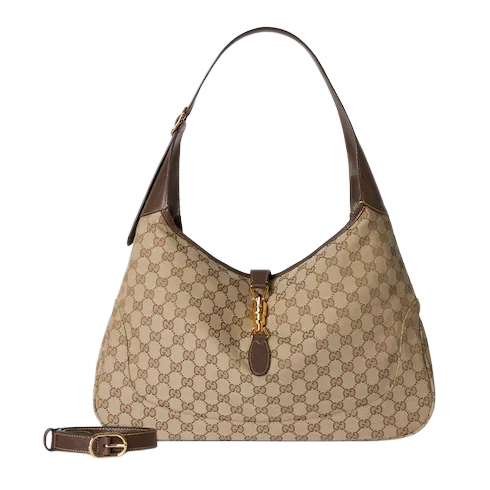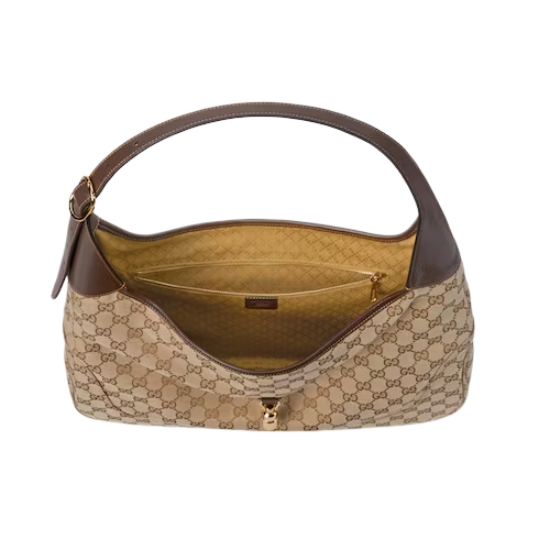 Introducing Spring Summer 2026. This new Gucci Jackie 1961 design is centered around the emblematic piston closure. Crafted from structured yet lightweight GG canvas, the style reveals tonal lining in the Diamante motif, taken from the archive. The bag can be carried over the shoulder, or crossbody with the detachable strap. This style is featured in the "Cocco di Mamma" look of La Famiglia.