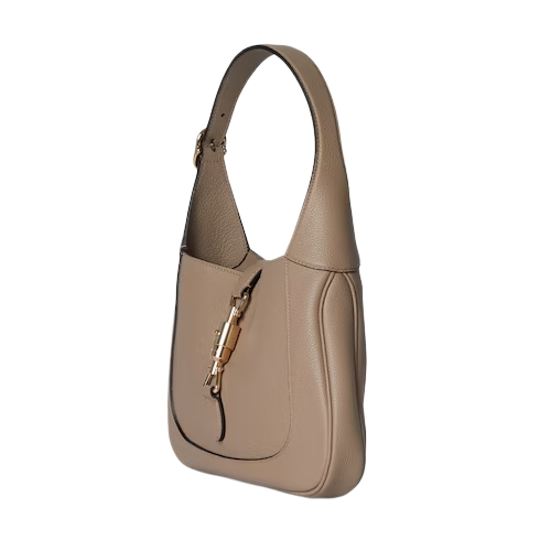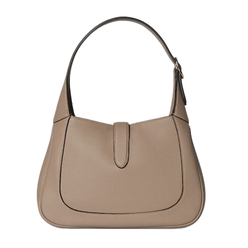 In the Fall Winter 2024 collection, the Gucci Jackie 1961 shoulder bag with new light gold-toned piston closure features fine taupe leather, highlighting the craftsmanship, crescent shape, and sleek silhouette of the House's iconic handbag. This medium size comes with a leather strap and additional green and red Web strap for different styling possibilities.
