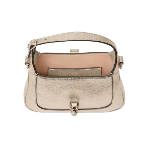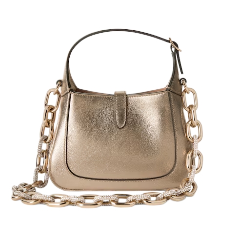 The Gucci Jackie 1961 tells an enduring story with its signature piston closure and emblematic shape. Crafted from metallic lamé leather, this bag is complete with an additional leather strap and reveals a color-coordinated leather lining.