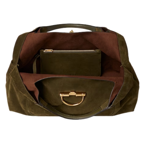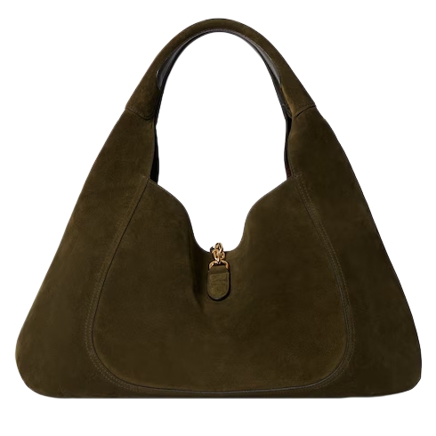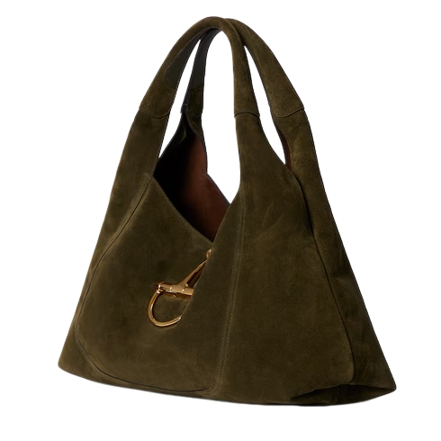 The Gucci Softbit shoulder bag reimagines the House’s signature hardware as an oversized half Horsebit. It is both aesthetic and functional as the magnetic closure of the relaxed silhouette. This style is crafted from suede in a rich hue that speaks to the season, complete with microfiber lining.
