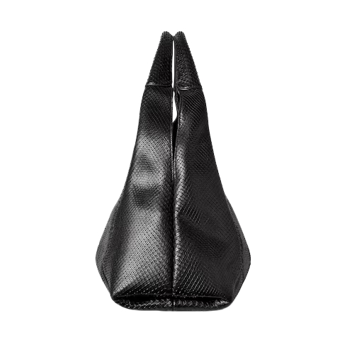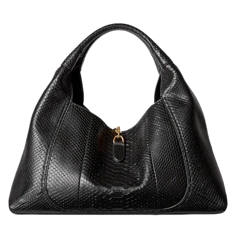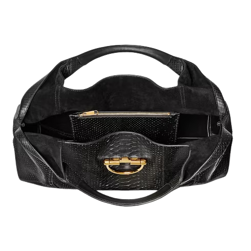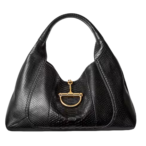 In the Fall Winter 2025 collection, the Gucci Softbit shoulder bag reimagines the House’s signature hardware as an oversized half Horsebit. It is both aesthetic and functional as the magnetic closure of the relaxed silhouette, crafted from python with leather lining.