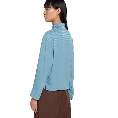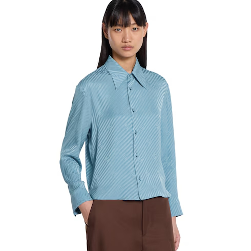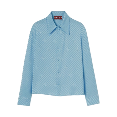 In the Fall Winter 2025 collection, this shirt is crafted from turquoise diagonal Interlocking GG silk jacquard. Designed with a pointed collar and a covered button closure, the style is finished with buttoned cuffs.