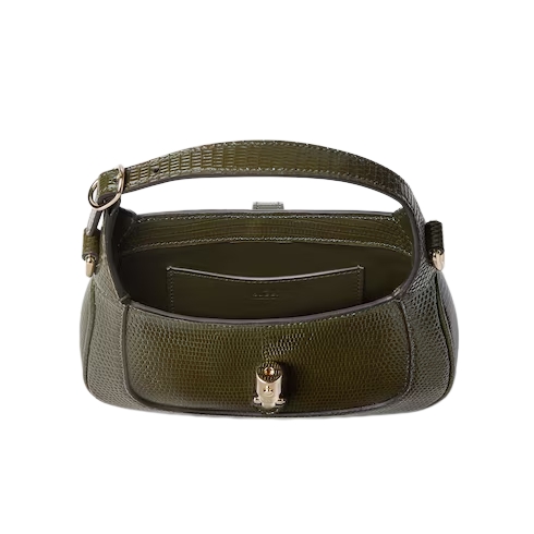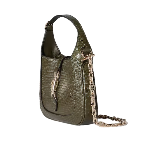 This Jackie 1961 mini bag is crafted from precious lizard leather in an emblematic shade, complete with light gold-toned hardware such as the signature piston closure and intricate chain shoulder strap.