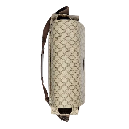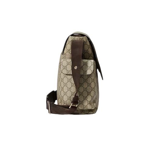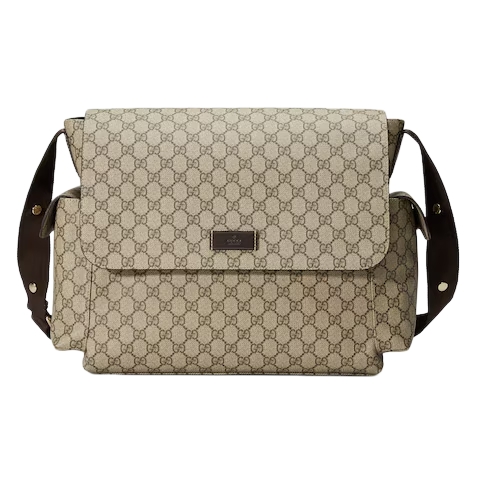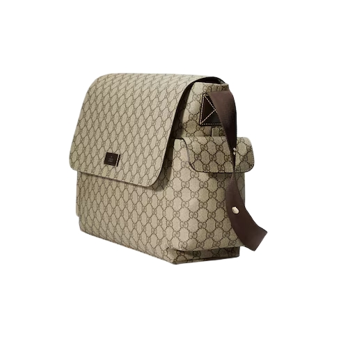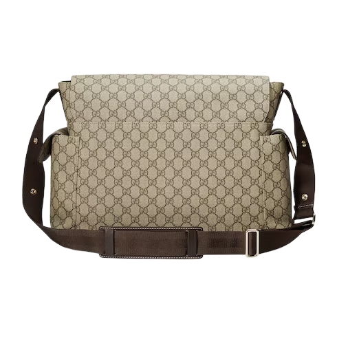 GG Supreme canvas diaper bag, designed with multiple pockets and fold-out changing mat.