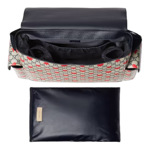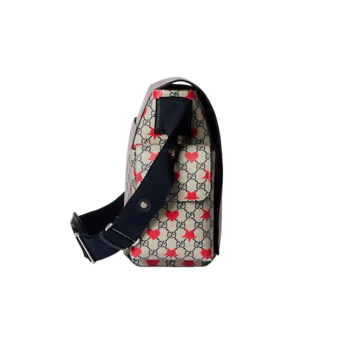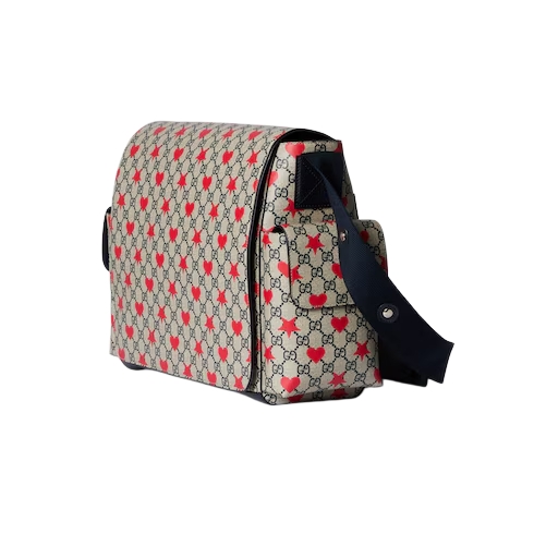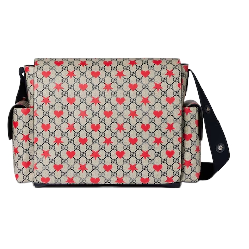 The children's Cruise 2025 collection presents a range of beloved motifs, including signature logo details. Crafted from a GG Supreme canvas, this diaper bag reveals an allover stars and hearts print and is defined by a dark blue strap.