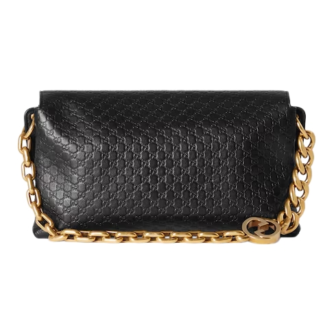The House's contemporary handbag silhouettes meet emblematic motifs. This sleek style features the Round Interlocking G detail on an antique gold-toned chain, and reveals a 2-gusset construction which offers capacious internal organization.