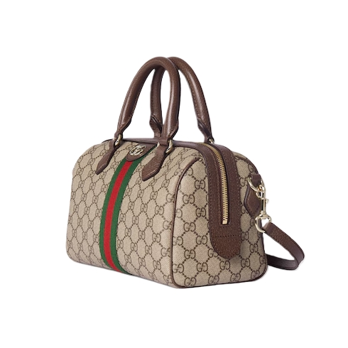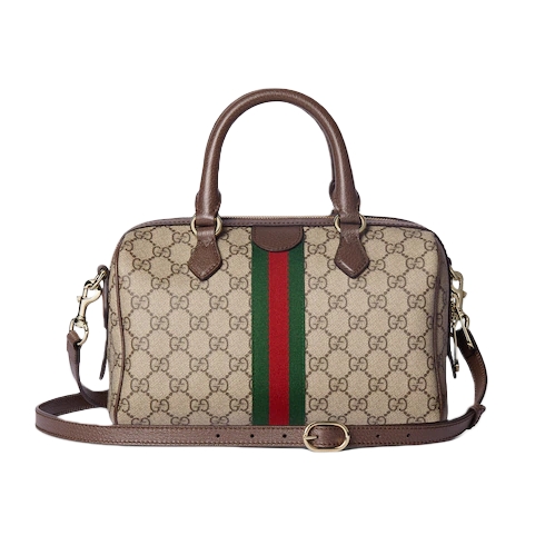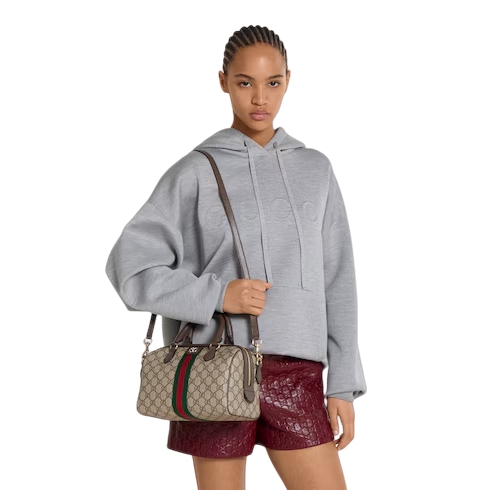 The Ophidia collection evokes the House’s heritage with the signature Web stripe and Double G emblem in light gold-toned finish. The styles are crafted from soft GG Monogram coated fabric, featuring green cotton lining inside.