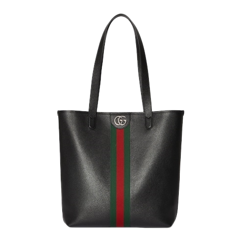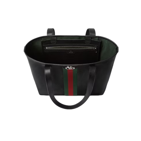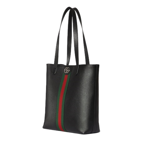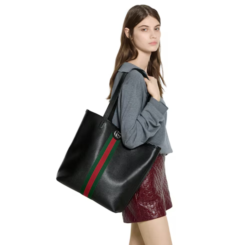 Ophidia in black features sophisticated leather, elevating signature silhouettes with new functions. This tote bag is presented in a soft leather with natural shine and is defined by a Double G and a Web detail.