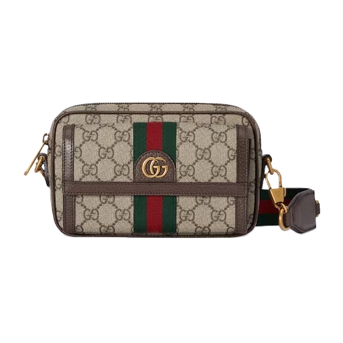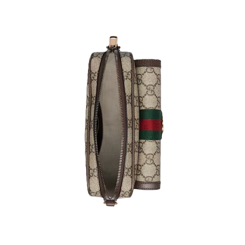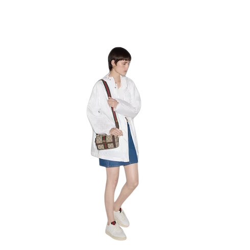 Gucci heritage meets contemporary design with the continuation of Ophidia. With its two archival details, the Web and the Double G hardware, the line takes on new shapes and dimensions in the Pre-Fall collection. This mini bag variation appears in beige and ebony GG Supreme canvas with a gold-toned hardware.