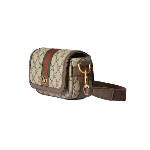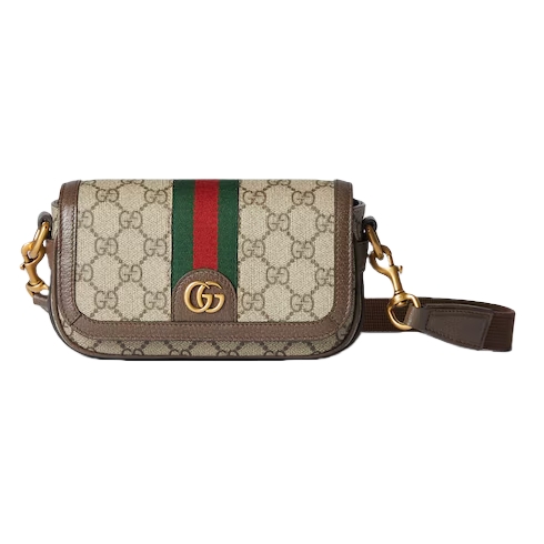 A selection of bags, including mini bags, briefcases and totes have been reshaped with functional details. Crafted from beige and ebony GG Supreme canvas, this Ophidia mini bag features one inside zip pocket, while the outside shows off the Double and Web stripe.